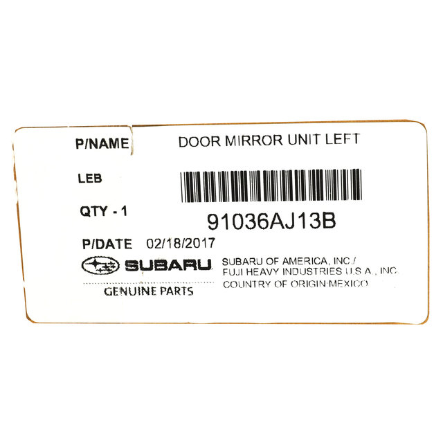 Subaru's history combining vehicle safety and strength makes it one of the safest cars on the market. This unique combination along with other safety features makes it ideal for drivers of all ages. Rest assured that this OEM NEW 2011-2014 Subaru Legacy Outback Driver Side Door Mirror Unit 91036AJ13C for your 2011-2014 Subaru vehicle is manufactured from Subaru and is 100% OEM. Subaru Parts & Accessories Limited Warranty.